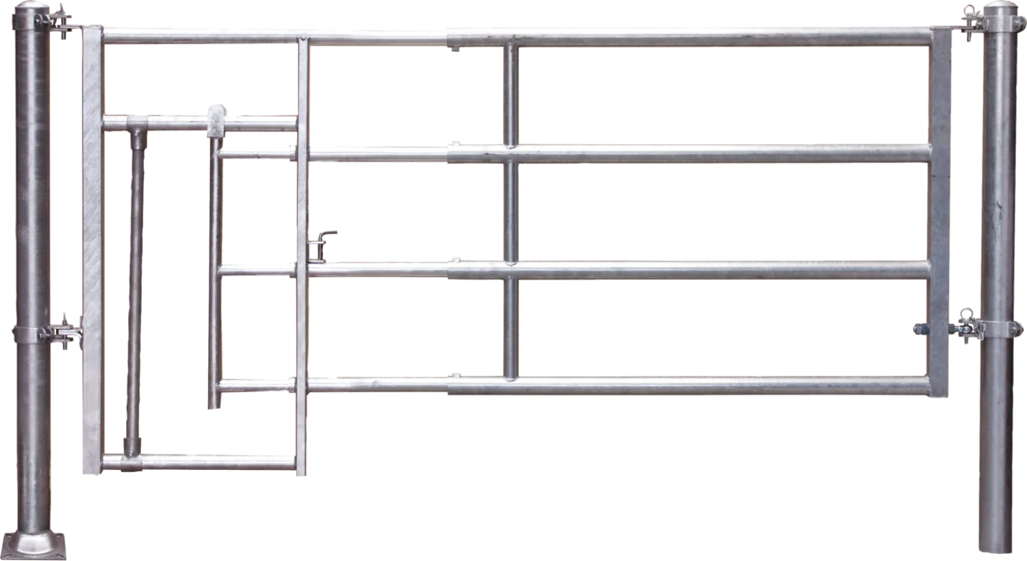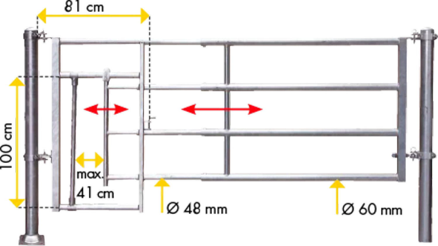 - Einschubteil Ø 48 mm, 2 angeschweißte Einhängelaschen (10 mm stark), mit Kälberschlupf Breite 81 cm, lichte Öffnung maximal 41 cm - auch verschließbar
