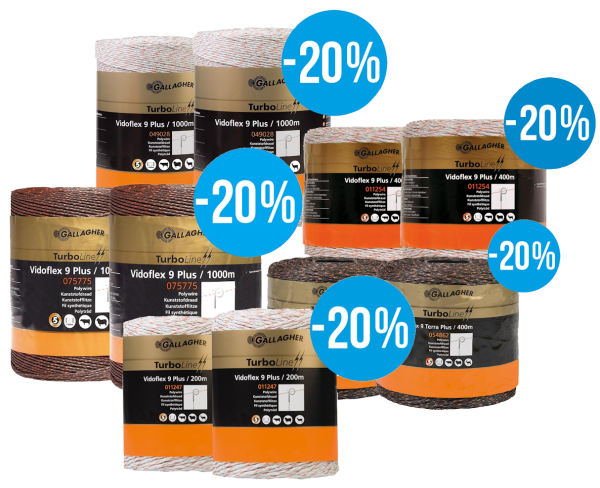 Im Duopack sparen Sie 20 % gegenüber der Einzelrolle Vidoflex 9 TurboLine Plus. Das Aktionsangebot besteht aus 2 gleichen Rollen Vidoflex 9. Das Beste an Leistung und Haltbarkeit bietet die Vidoflex 9 TurboLine Plus, die geflochtene Kunststofflitze für mobile Zäune von mehr als 500 Meter Länge. Die 6 Edelstahldrähte und 3 verzinnte Kupferdrähte gewährleisten eine 40x bessere Leitfähigkeit, die seinesgleichen sucht. Diese TurboLine Plus Ausführung ist 50 % reißfester, dehnt sich nicht aus und ist sehr gut sichtbar. UV-Garantie 5 Jahren.