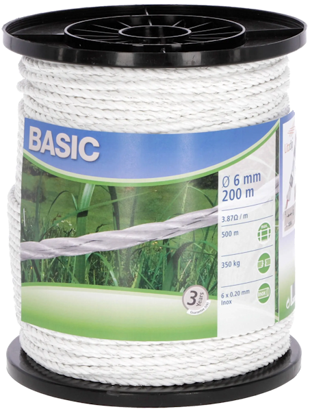 Das Basic Weidezaunseil 6 mm ist ein preisgünstiges langlebiges Weidezaunseil für kurze Zäune. Die Kunststofffasern bestehen aus witterungsbeständigem Polyetylen.