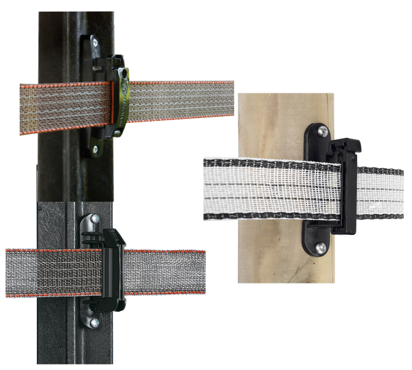 Die Befestigung des Breitbandes ist sehr einfach. Mit einem Klick klemmen Sie das Band zwischen die beiden festen Gummiteile. Dies gewährleistet die solide Befestigung des Breitbandes und verlängert die Lebensdauer des Zaunes ganz erheblich.