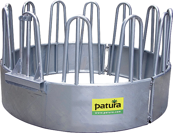 Die kreisförmige, aus 3 Segmenten bestehende Rundraufe ermöglicht durch die runde Bauweise ein gleichzeitiges Fressen von Tieren unterschiedlichen Ranges. Die Raufe ist sowohl mit als auch ohne Dreipunktanhängung erhältlich. Die Befüllung erfolgt von oben mit dem Frontlader oder auch durch Öffnen eines Segmentes und Einrollen des Ballens mit der Hand. Mit dem separat erhältlichen Dach (Ref. 303521) ist das Futter gegen Witterungseinflüsse geschützt.