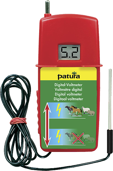 Das ideale Spannungsmessgerät mit Digitalanzeige, Erdstab und Zaunkontakt. Zur optimalen Kontrolle des Elektrozaunes hat der Digital-Voltmeter einen eingebauten zuschaltbarem Belastungswiederstand, welche eine Tierbrührung simuliert.