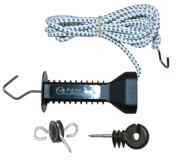 Das E-line Torgriff-Set hat ein stromführendes Elastikseil und ist dadurch besonders für Pferdezäune geeignet.