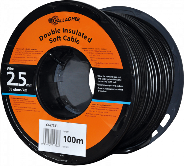 Das doppelt isoliertes Erd- und Zuleitungskabel 2,5 mm ist zur Verbindung des Weidezaungerätes an den Zaun und für Erdungsverbindungen (z.B: Tore). Der verzinkte Drahtkern mit einem Durchmesser von 2,5mm macht dieses Kabel besonders für Entfernungen von mehr als 50 Meter notwendig