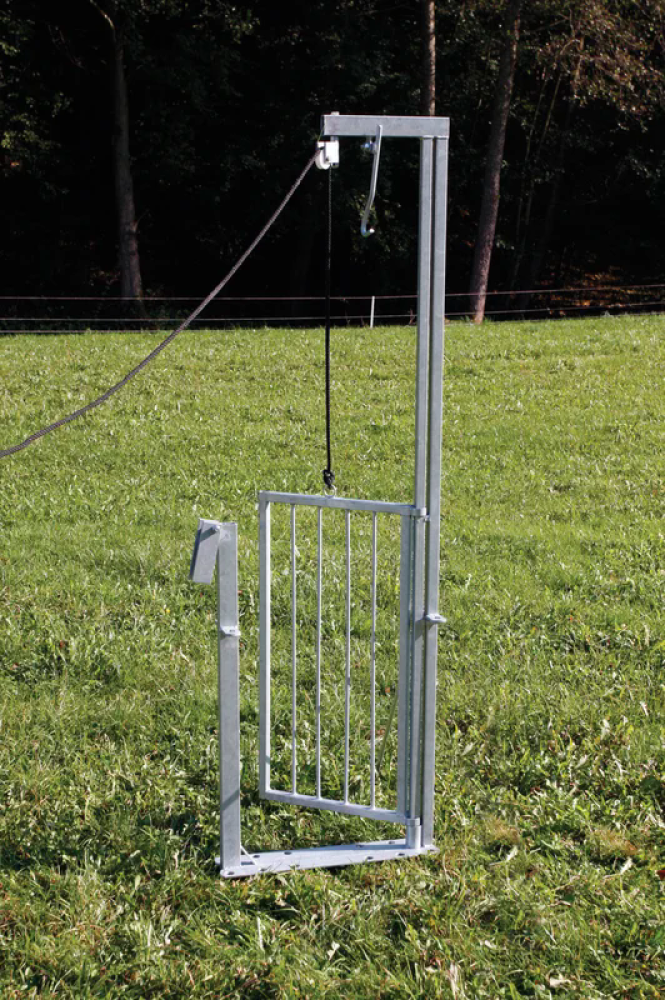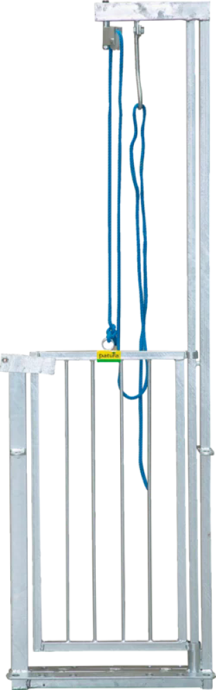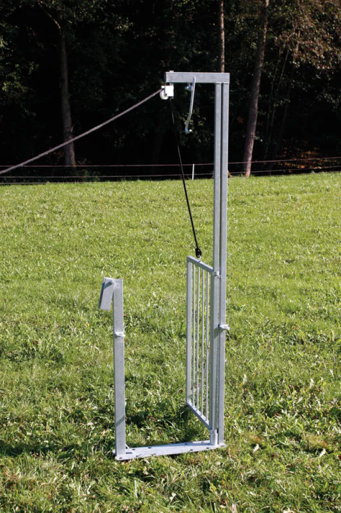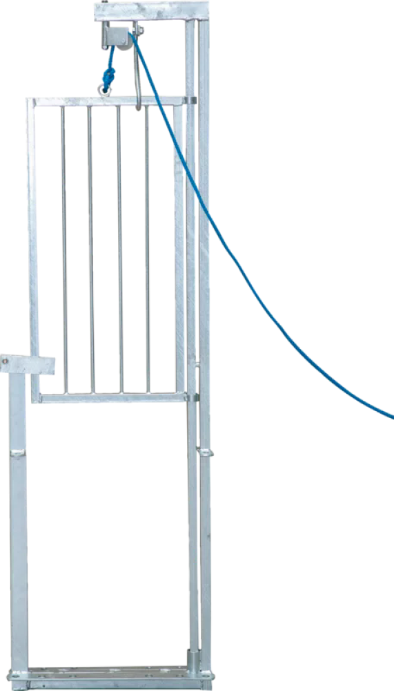Mit dem Falltor mit Seilbetätigung werden die Schafe einzeln oder in Gruppen aus dem Sammeltrichter in den den Laufgang eingelassen und / oder aus dem Laufgang entlassen.