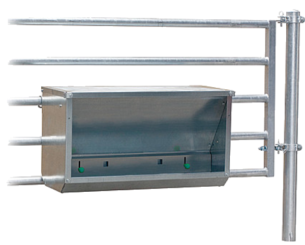 Der Kälber-Kraftfutterautomat ist zum Einhängen an Abtrennungen und hat ein Fassungsvermögen von 190 Litern.