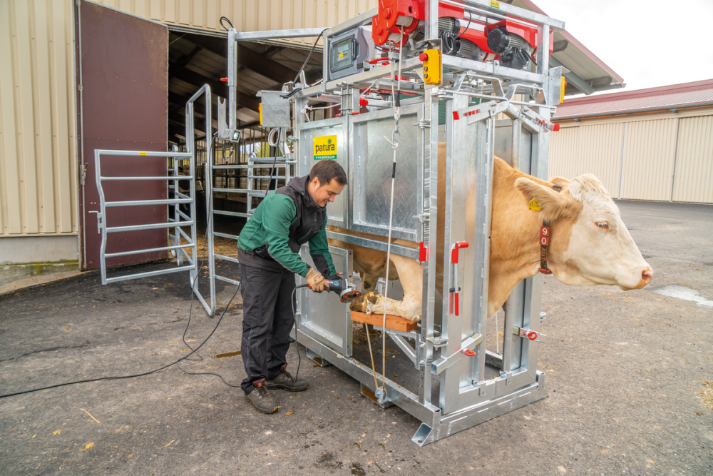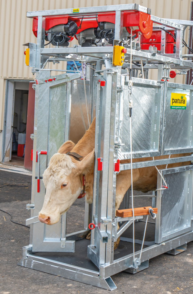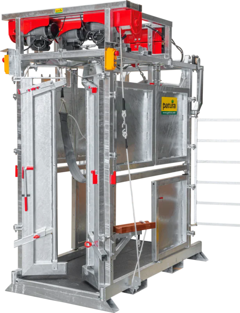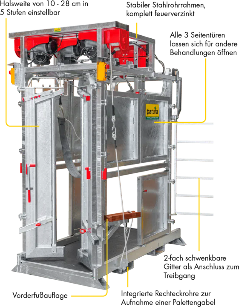 Der PATURA Klauenpflegestand Profi E ermöglicht die komfortable und professionelle Klauenpflege in größeren Tierbeständen. Die Vorderfuß-, Hinterfuß- und die Bauchgurtwinde sowie die Rücklaufsperre werden jeweils mit einem Elektromotor betrieben. Eine LED-Beleuchtung sowie Steckdosen zum Anschließen Ihrer Werkzeuge machen die Arbeit besonders leicht. Der Halsfangrahmen ist so konstruiert, dass das Tier beim Betreten automatisch gefangen wird. Alle Seitentüren lassen sich auch für andere Behandlungen öffnen und ermöglichen auf diese Weise den bestmöglichen Zugang zum Tier. Ein stabiler Stahlrohrrahmen sowie die komplette Feuerverzinkung sorgen für höchste Qualität.