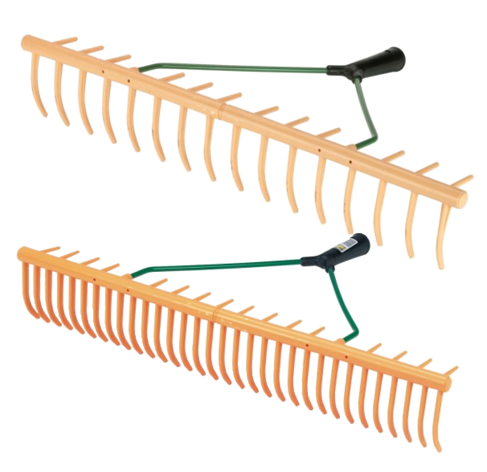 Kunststoff-Rasenrechen mit gebogenen Zinken und zusätzlichen Grasfangzinken auf der Rückseite.
