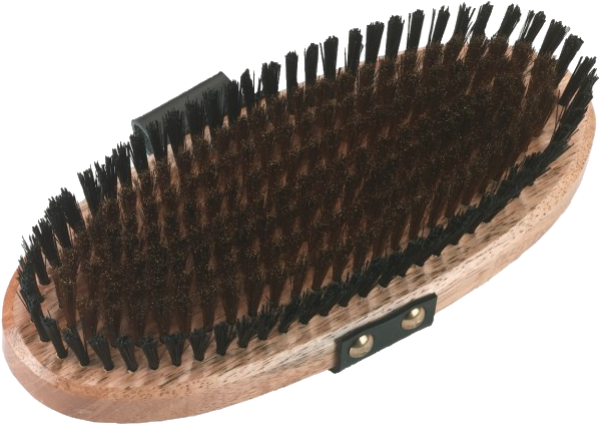 • 9-reihiges Borstenfeld, davon 7 Reihen aus gewelltem Messingdraht und 2 Randreihen aus Nylon-Borsten • Holzoberfläche lackiert • Handgurt aus Leder L x B: 21,5 x 10 cm