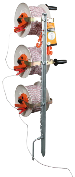 Das Produkt für die vorübergehende Einzäunung bzw. Portionsbeweidung. An diesem Haspeleckpfahl sind drei Haspeln mit Übersetzungsmechanismus und 400m Vidoflex Kunststoffdraht angebracht. Damit können Sie schnell und einfach einen Teil der Weide abtrennen. Die Höhe des Haspeleckpfahls beträgt 1070 mm.