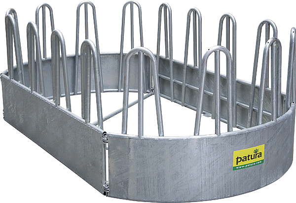 Die aus 4 Teilen bestehende Ovalraufe ermöglicht ein gleichzeitiges Fressen von Tieren unterschiedlichen Ranges. Zwei Diagonalstreben sorgen für eine stabile Verbindung. Die Raufe bietet Platz für einen Großpacken oder zwei Rundballen.