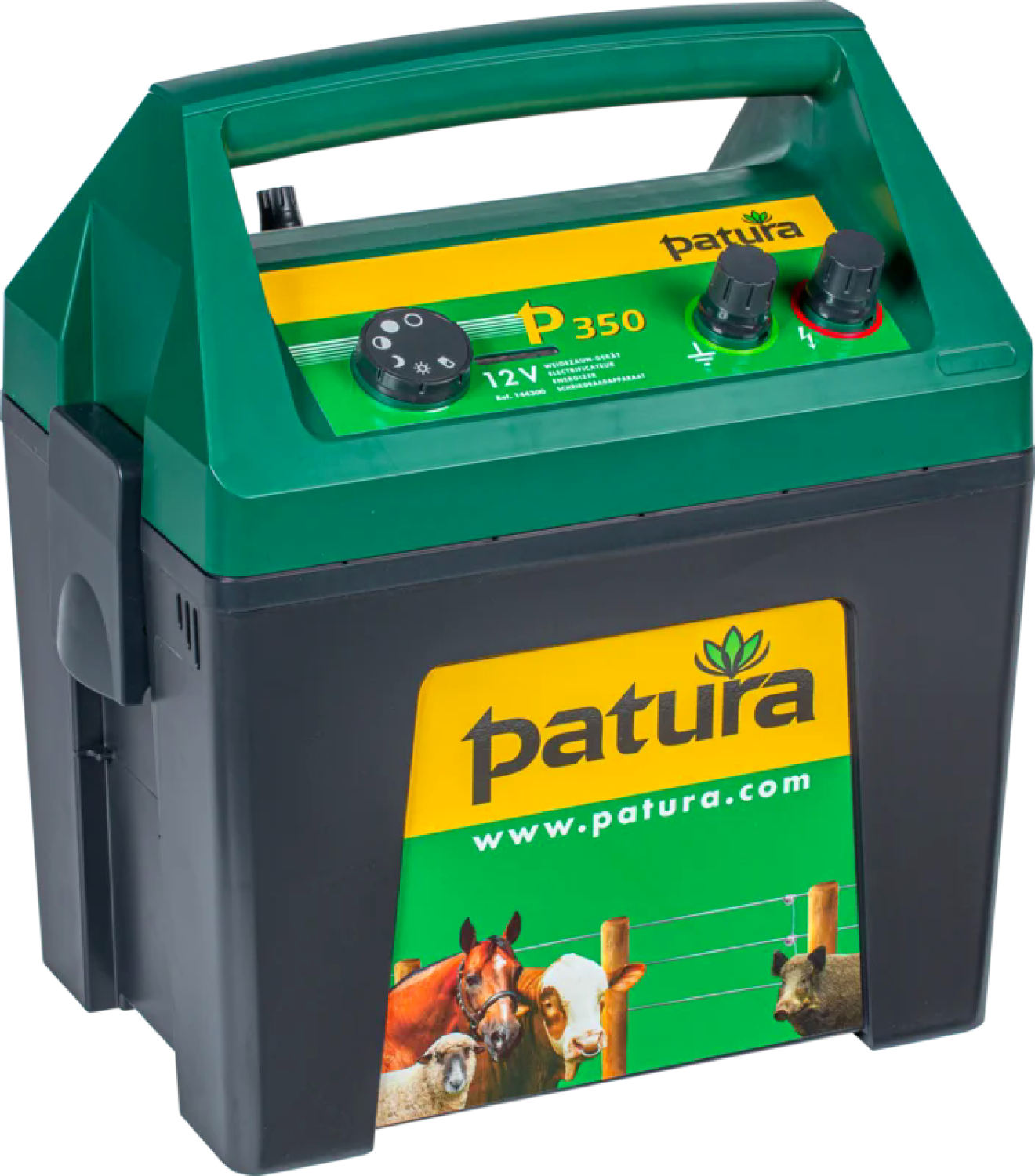 Die Patura MaxiBox P 350 ist ein besonders leistungsstarkes Gerät im kompakten Gehäuse zur Aufnahme eines 12 V Akkus; für alle Einsatzbereiche auch mit stärkerem Bewuchs am Zaun und für schwer kontrollierbare Tierarten; inkl. Zaun- und Erdkabel