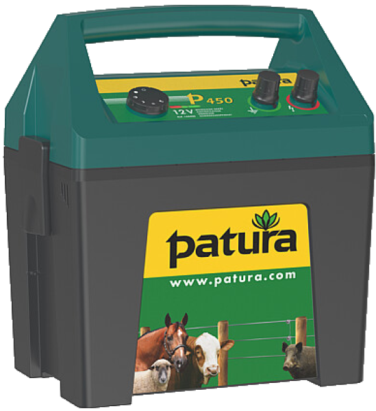 Die leistungsstärkste Patura MaxiBox P 450 mit 4,8 Joule Impulsenergie eignet sich für den Weidebetrieb und auch zur Wildabwehr. im kompakten Gehäuse zur Aufnahme eines 12 V Akkus; für alle Einsatzbereiche auch mit starkem Bewuchs am Zaun und für schwer kontrollierbare Tierarten einschließlich Wildtieren; inkl. Zaun- und Erdkabel