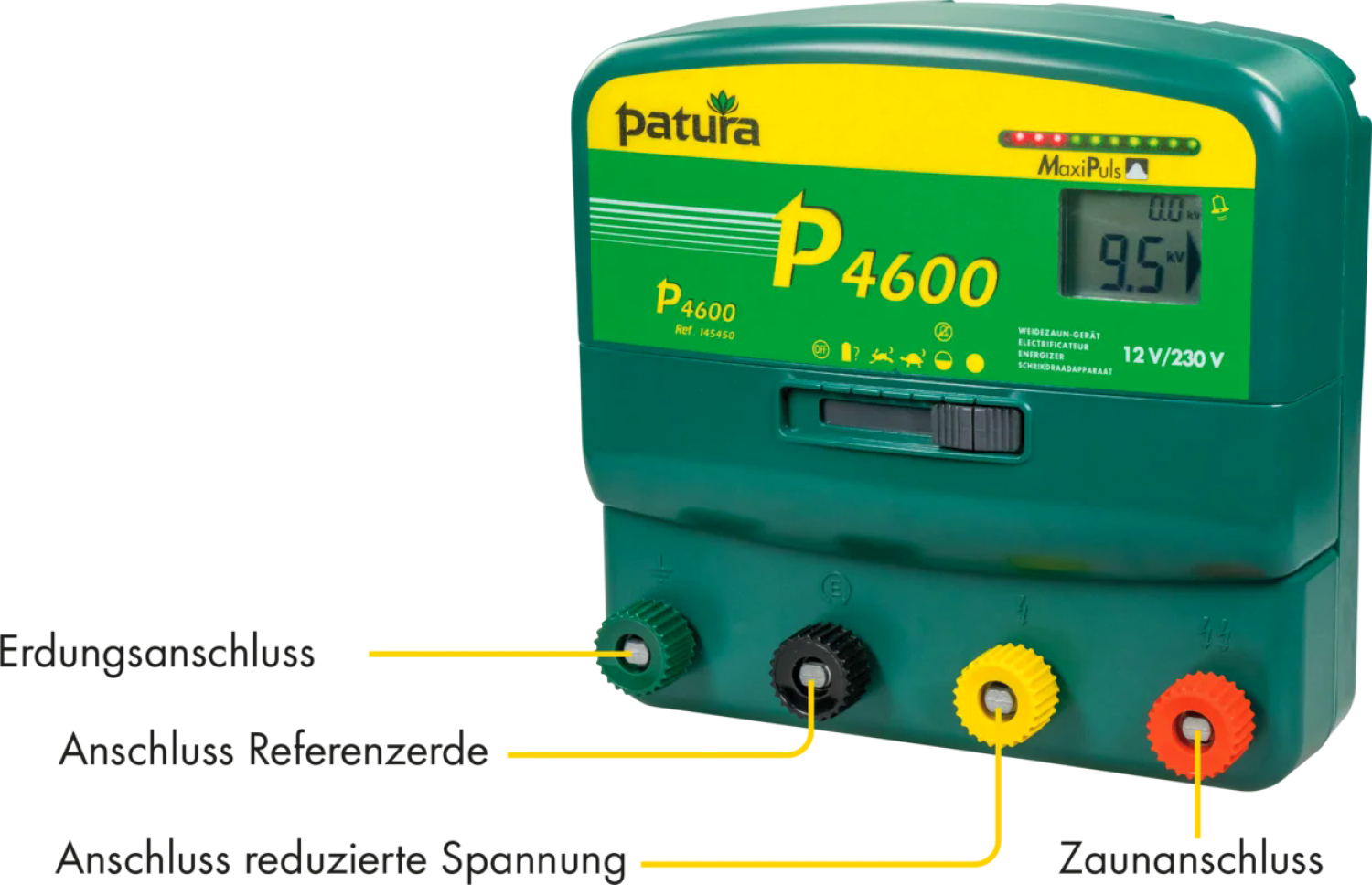 Das Patura Multifunktionsgerät P 4600 mit MaxiPuls-Technologie für lange Zäune mit starkem Bewuchs für Rinder, Schafe, Pferde und Wildabwehr; 10-stufige Zaun- und Batteriekontrolle, 6-Stufenschalter, Tiefentladeschutz; Digitalanzeige zur Zaun-, Erdungs- und Batteriekontrolle; Erdungskontrolle über Referenzerde; inkl. 230 V Netzteil, 12 V Edelstahl-Anschlusskabel und Zaun-/Erdkabelset