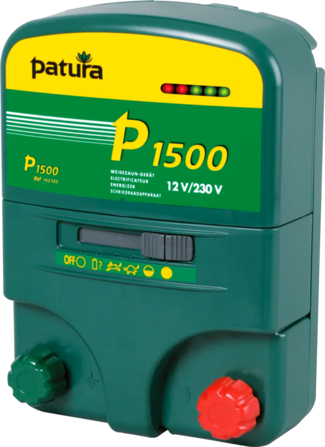 Das Patura Multifunktions-Gerät P 1500 mit neuester, effizienter Gerätetechnologie für kurze Zäune mit leichtem Bewuchs für Rinder und Pferde; 5-stufige Zaun- und Batteriekontrolle, 6-Stufenschalter, Tiefentladeschutz; inkl. 230 V Netzteil, 12 V Edelstahl-Anschlusskabel und Zaun- / Erdkabelset,