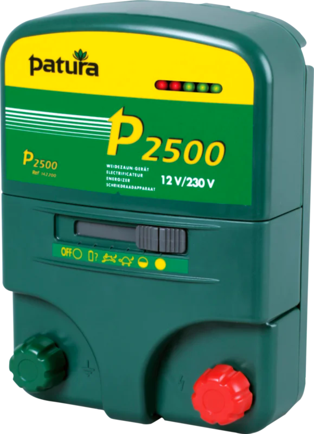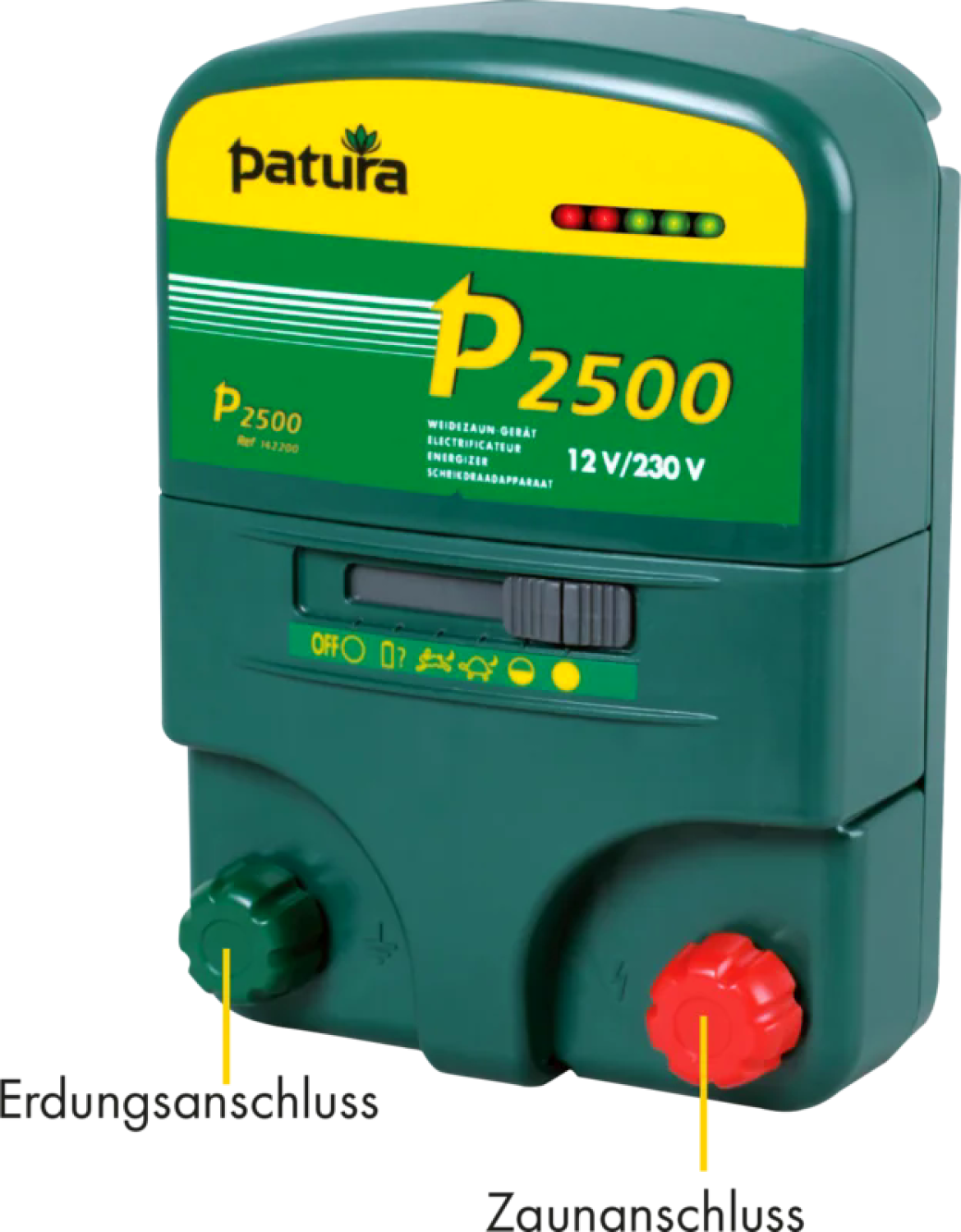 Das Patura Multifunktions-Gerät P 2500 mit neuester, effizienter Gerätetechnologie für Zäune mit normalem Grasbewuchs; 5-stufige Zaun- und Batteriekontrolle, 6-Stufenschalter, Tiefentladeschutz; inkl. 230 V Netzteil, 12 V Edelstahl Anschlusskabel und Zaun- / Erdkabelset,