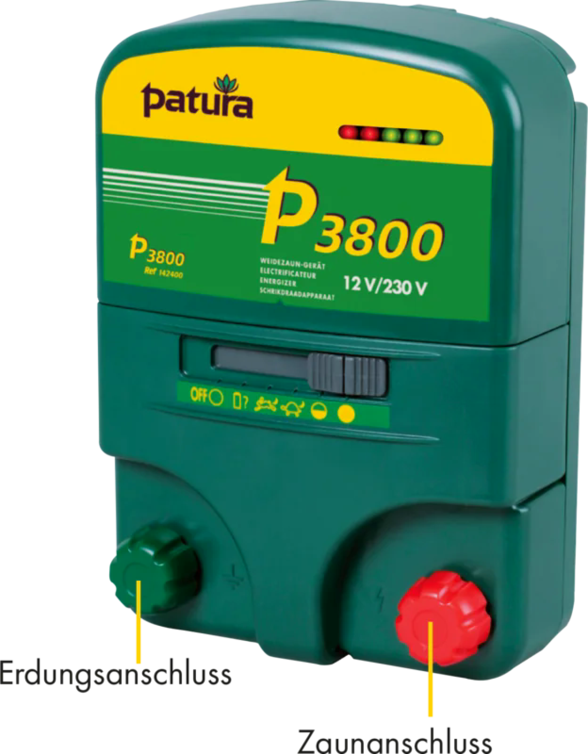 Das Patura P 3800 Multifunktions-Gerät mit neuester, effizienter Gerätetechnologie, auch für längere Zäune mit stärkerem Grasbewuchs; 5-stufige Zaun- und Batteriekontrolle, 6-Stufenschalter, Tiefentladeschutz; inkl. 230 V Netzteil, 12 V Edelstahl-Anschlusskabel und Zaun- / Erdkabelset,