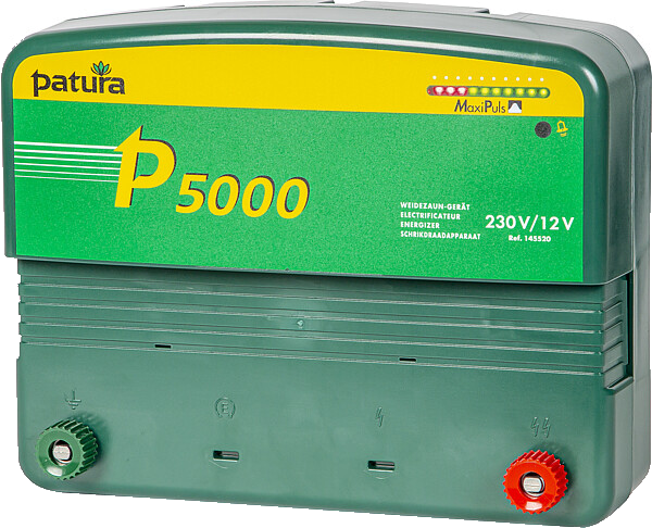 Das Patura P 5000 Netzerät (für 12 V-Betrieb wird das Batterieanschlusskabel Ref. 9187225 benötigt) mit MaxiPuls-Technologie für lange Zäune mit stärkerem Bewuchs für Rinder, Schafe, Pferde und Wildabwehr; 10-stufige Zaunkontrolle, inkl. 230 V Netzteil