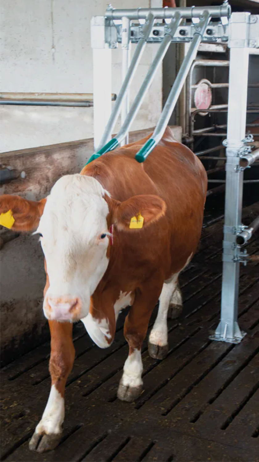 Das innovative und robuste Ein-Wege-Tor bietet dem Milchviehhalter die Möglichkeit den Kuhverkehr zu steuern. Das Fingergatter kann in verschiedenen Breiten eingebaut werden und eignet sich besonders gut an Ausgängen von Melkrobotern, Melkständen oder Ausläufen. Auch in Treibgängen und Selektionsbereichen findet das Fingergatter durch sein modulares Baukasten-System seinen Einsatz. Das Trägergestell punktet durch eine massive Bauweise mit je einem Quadratrohr 80 x 80 mm und einem 60,3 mm Rundrohr. Große, langlebige Gummipuffer sorgen für eine Lärmreduzierung beim Zurückfallen der Finger. Aufgrund der nur in eine Richtung schwingenden Fingermodule verläuft das Anlernen der Tiere ohne Probleme.