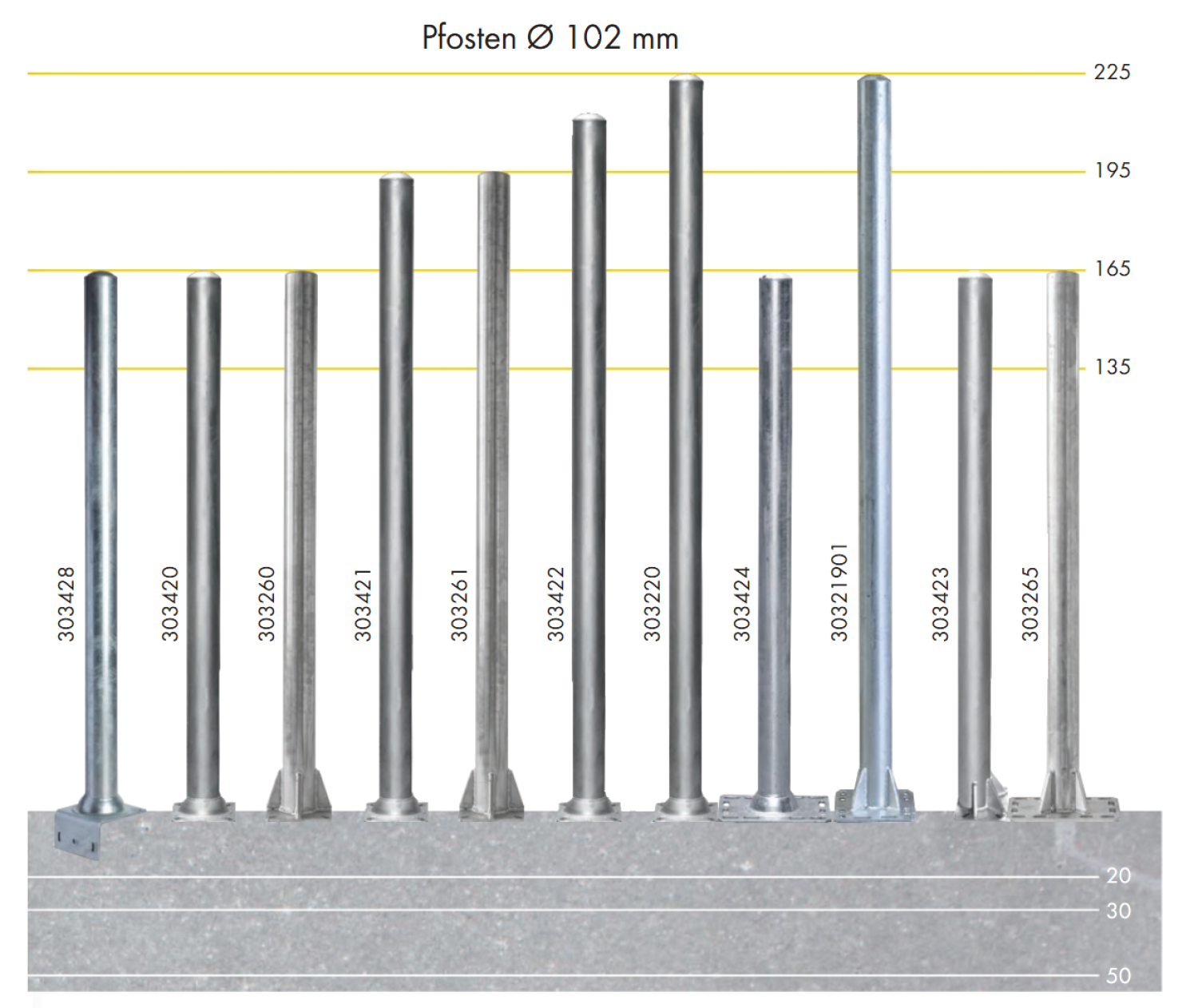 Pfosten Ø 102 mm mit Bodenplatte aus Edelstahl oder verzinkt mit 4 mm Wandstärke.