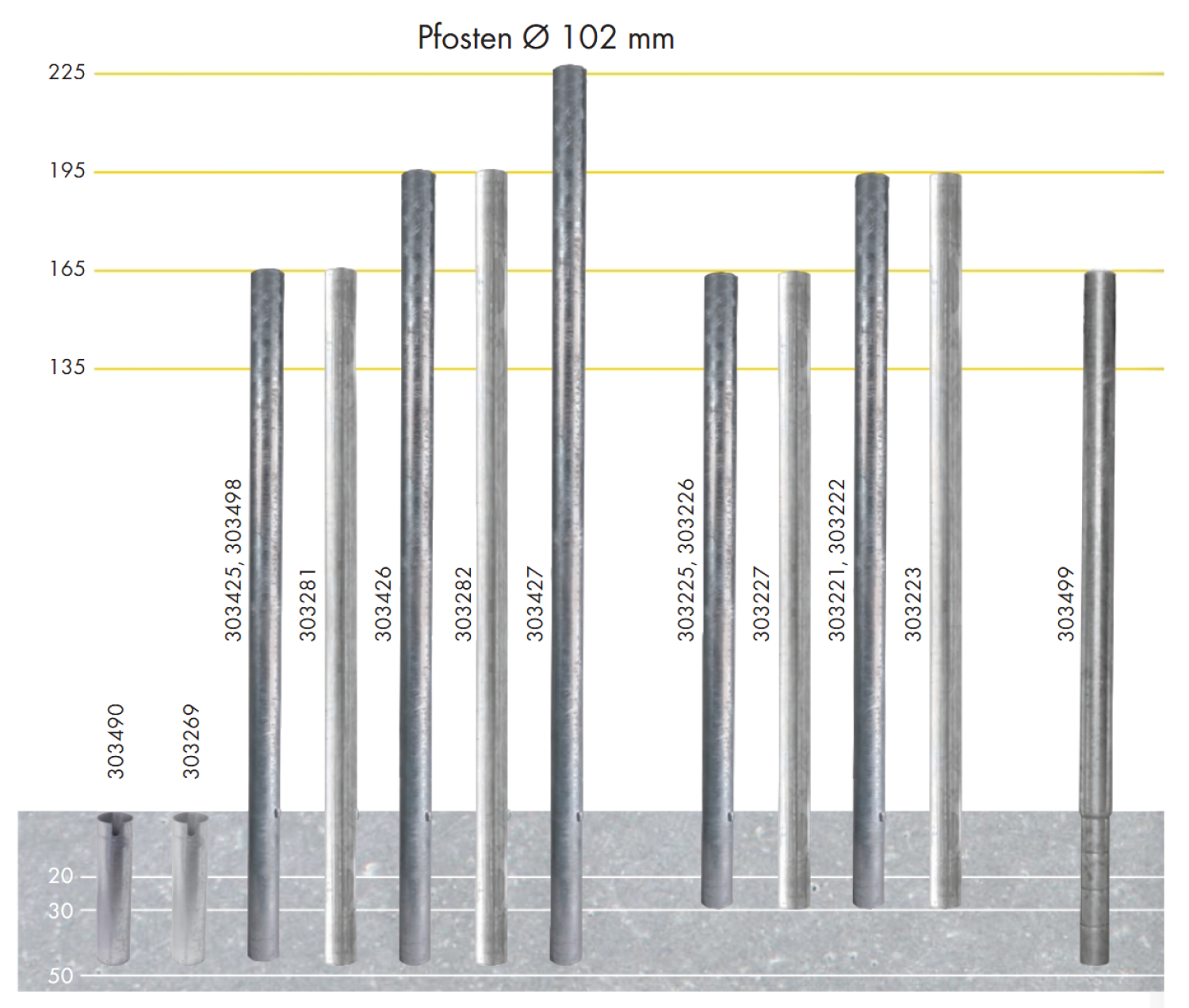 Pfosten Ø 102 mm verzinkt mit 4 oder 6 mm Wandstärke, wahlweise auch aus Edelstahl zum Einbetonieren