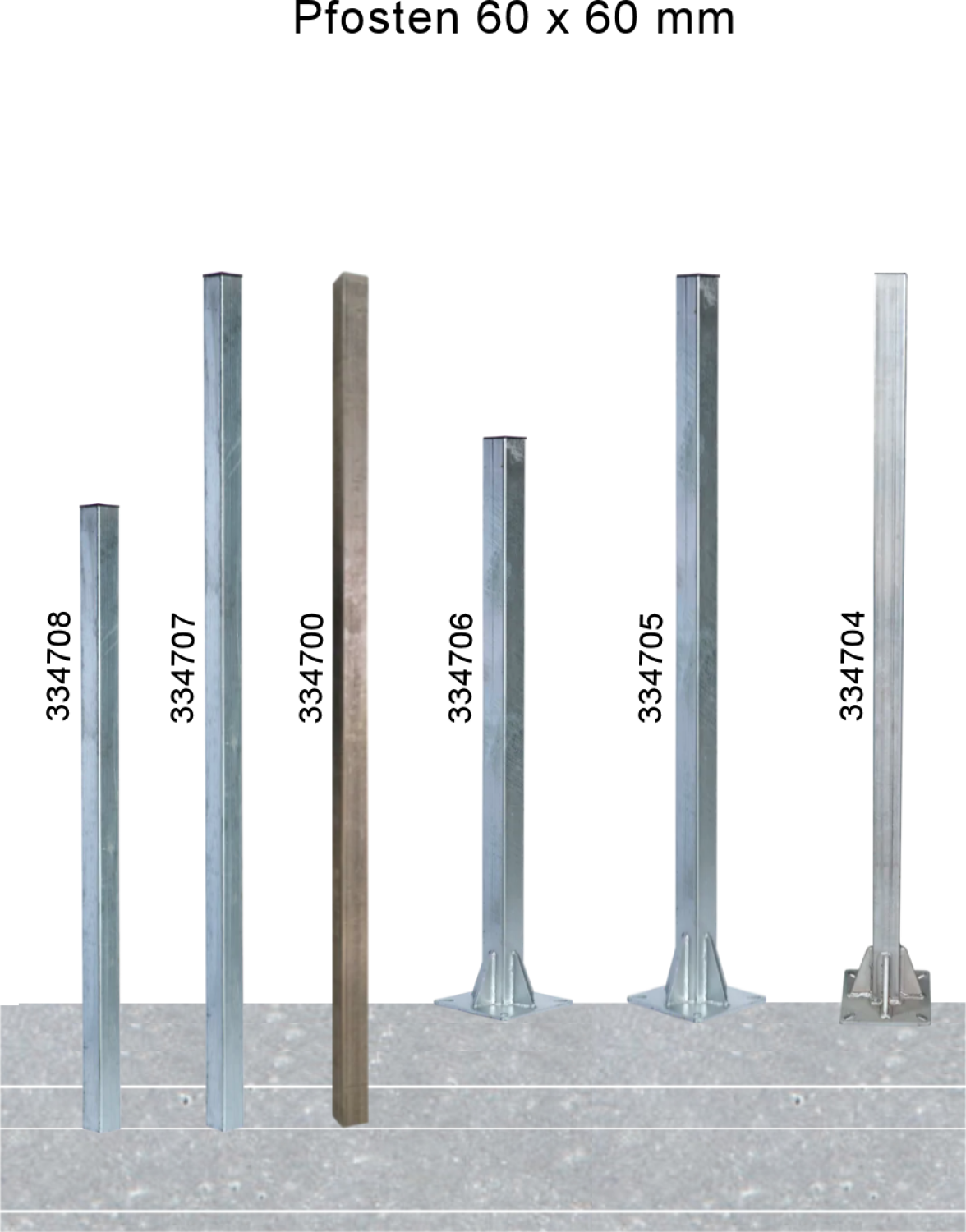 Den Pfosten 60 x 60 mm mit einer Wandstärke von 3,0 mm gibt es zum Einbetonieren oder mit Bodenplatte.