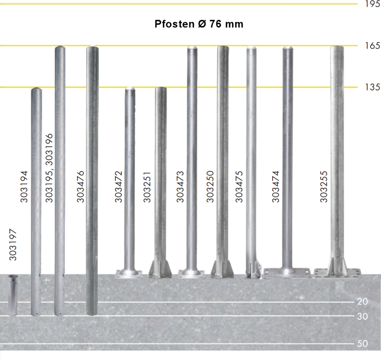 Der Pfosten mit 76 mm Durchmesser hat eine Wandstärke von 3,6 mm und ist in 10 verschiedenen Ausführungen erhältlich.