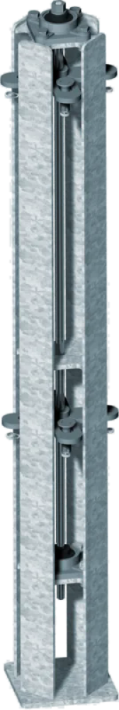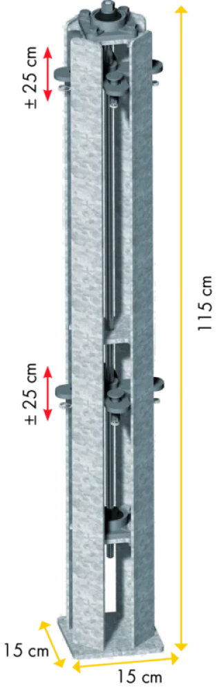 Dank der innenliegenden Trapezgewindespindel erfolgt die Höhenverstellung der Halterungen mühelos und stufenlos.Eine exakte Anpassung der Stalleinrichtungselemente an die jeweilige Höhe der Mistmatratze ist möglich - ohneaufwendige manuelle Hebearbeiten.