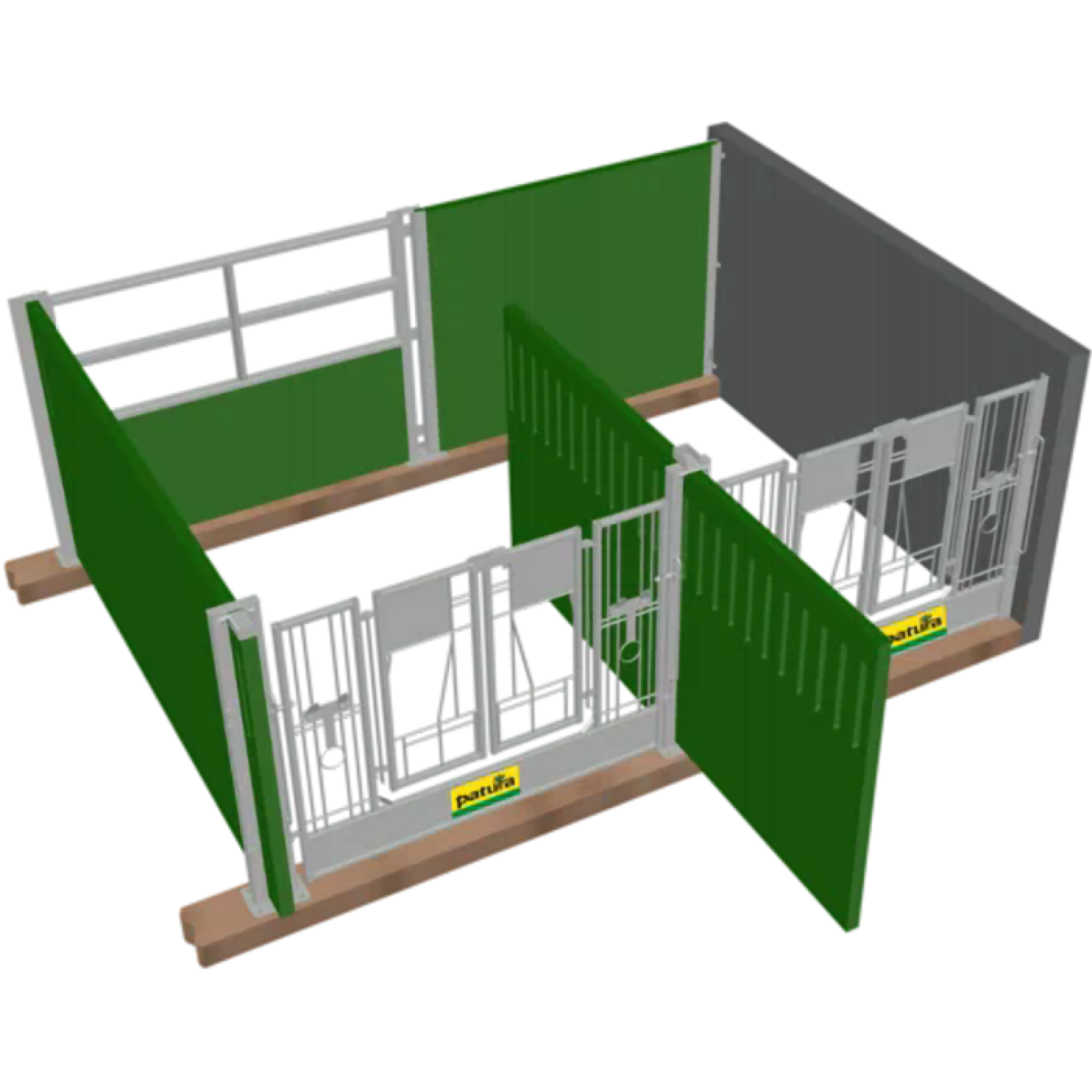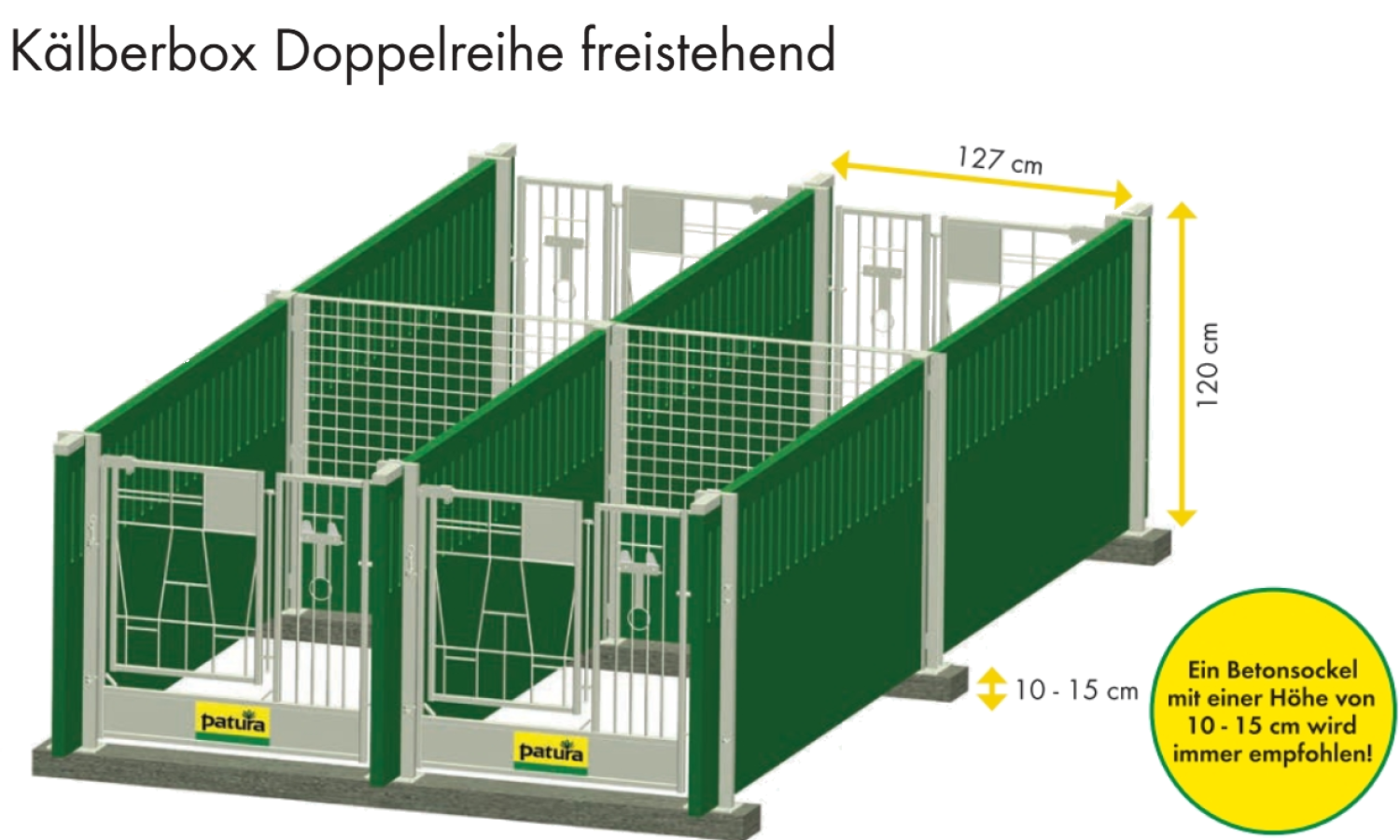 Die neu gewählte Breite der PATURA Kälberbox von 1,54 m sorgt für ausreichend Platz und bildet die Grundlage für eine Paarhaltung der Kälber. Das zentrale Element der Kälberbox ist die Zugangstür, diese ist mit insgesamt 2 Fressplätzen für die Fütterung mit Nuckel-Tränkeeimern konzipiert und zusätzlich auch für eine automatische Fütterung auslegt. Alle weiteren Produkte wurden auf die Maße für die Paarhaltung angepasst und funktionieren nach dem bewährten Baukastensystem der PATURA Kälberbox. Diese kann, wie gewohnt, durch Herausziehen der Seitenwände zu einer Gruppenhaltung umgestaltet werden kann.