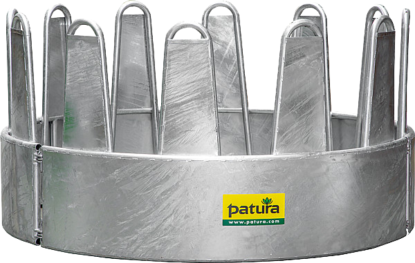 Die Rundraufe für Pferde verhindert durch die Blechverkleidung kritischer Zwischenräume ein Verfangen der Tiere im Fressgitter. Aussparungen im oberen Bereich der Palisadenbögen ermöglichen einen hängenden Transport der Raufe.