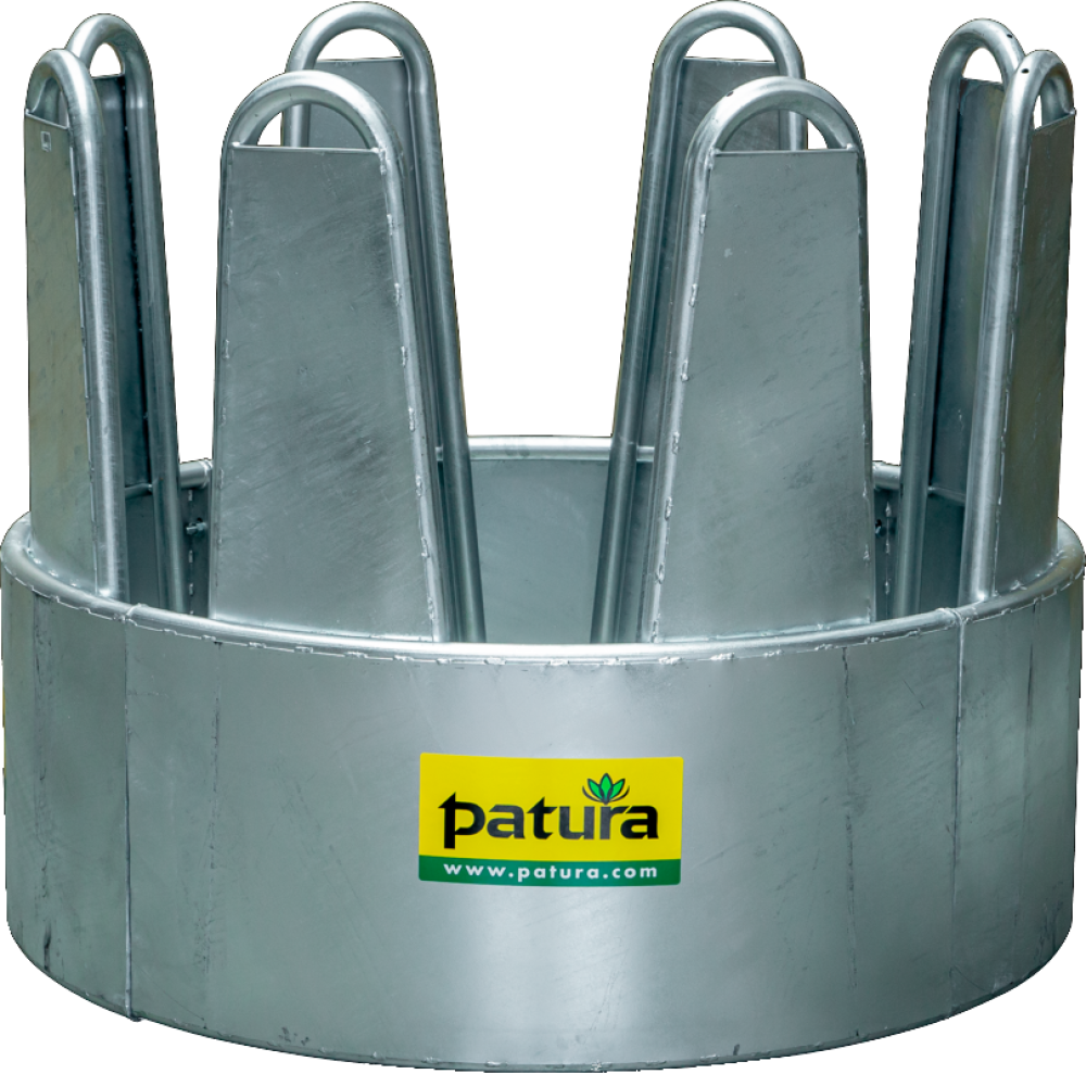 Die Rundraufe für Pferde verhindert durch die Blechverkleidung kritischer Zwischenräume ein Verfangen der Tiere im Fressgitter. Aussparungen im oberen Bereich der Palisadenbögen ermöglichen einen hängenden Transport der Raufe.