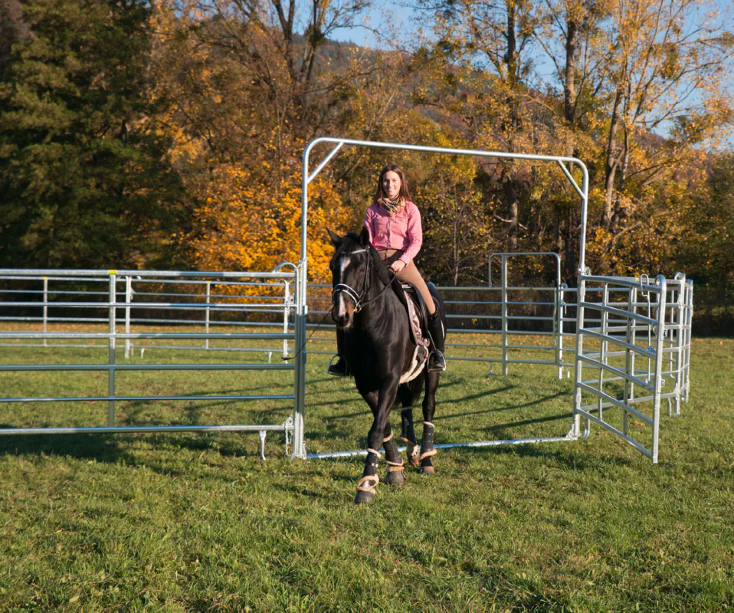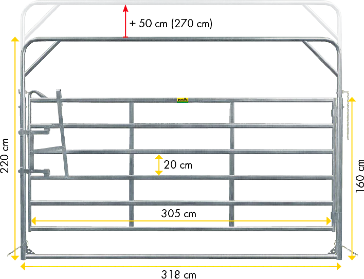 Dank des zweifach höhenverstellbaren Rahmens sowohl im Eintreibebereich einer Behandlungsanlage für Rinder ideal, als auch für Reitplatzeingänge nutzbar. Die Durchgangshöhe kann von 2,20 m auf 2,70 m erhöht und damit auch reitend passiert werden. Dank der Einhandbedienung kann das Tor vom Pferd aus geöffnet und auch wieder geschlossen werden.