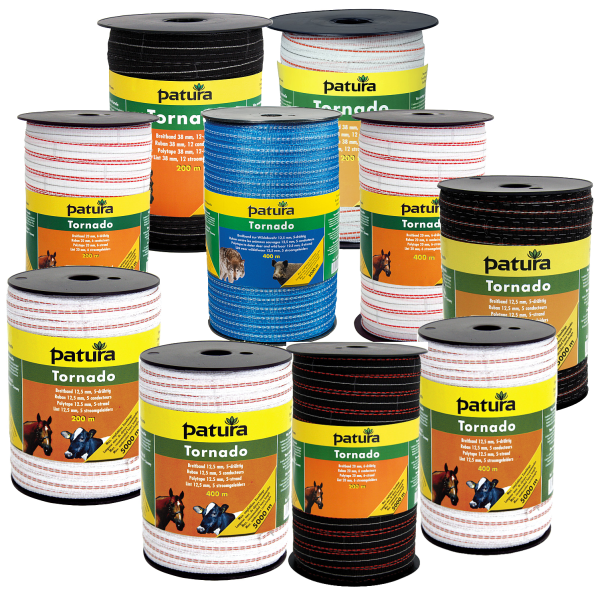 Das Tornado Breitband von Patura ist für Zäune mit einer Zaunlänge bis 5.000 m zu empfehlen. Je höher der Widerstand desto geringer die Leitfähigkeit. Die Querverbindung der Stromleiter sorgt für optimale Stromführung. Das Breitband gibt es mit 12,5 mm, 20 mm und 38 mm Breite.