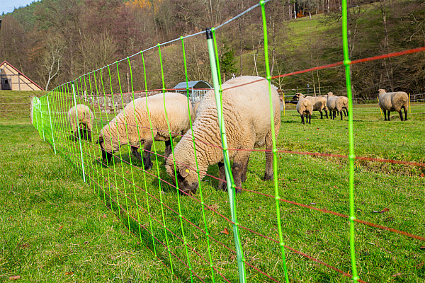 Das TornadoXL Kombi (mit starren senkrechten Kunststoffstreben) Elektrozaunnetz mit zusätzlichen Kupferleitern für Schafe und Lämmer für höchste Schlagstärke auch auf langen Strecken.