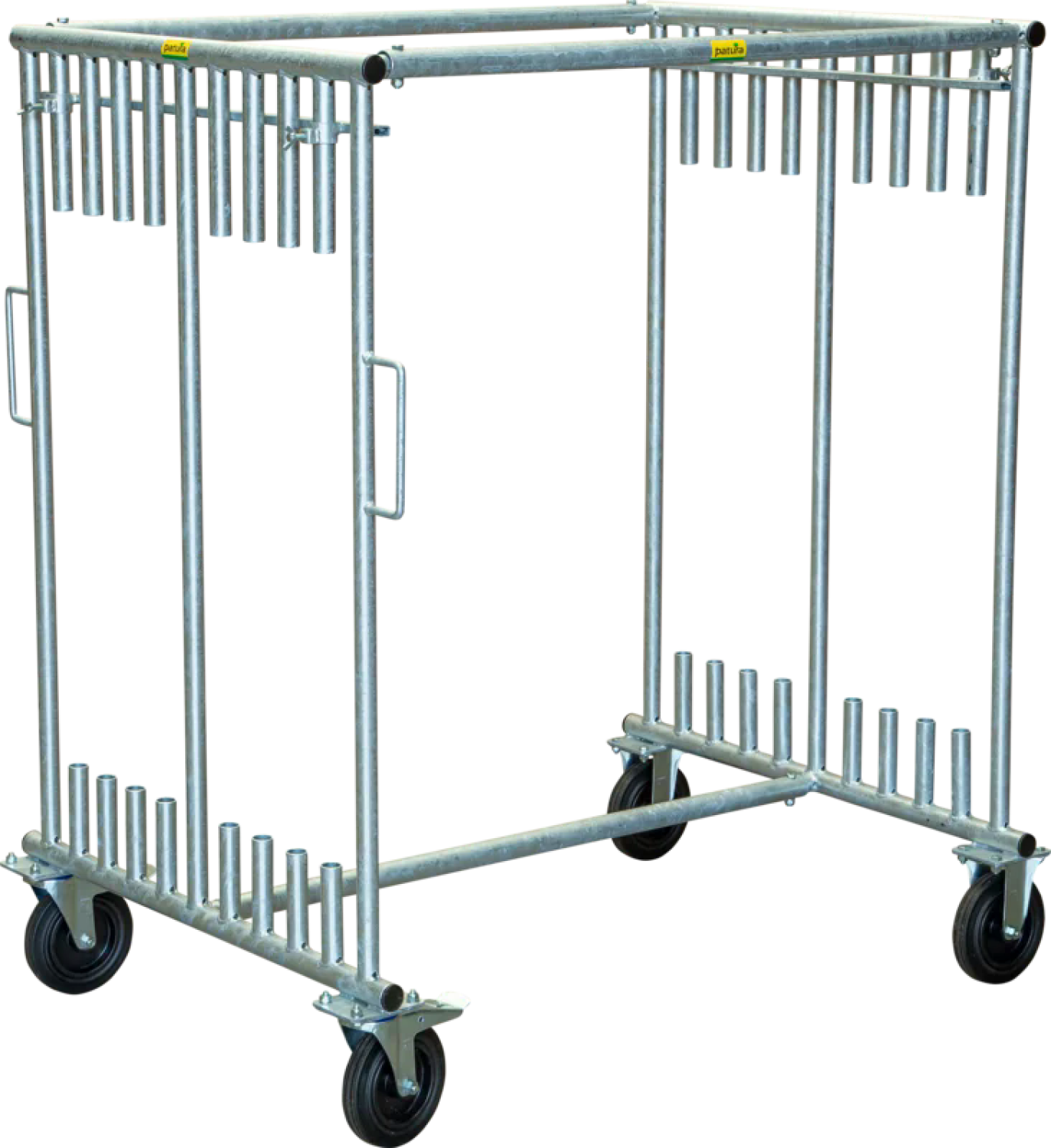 Der Transportwagen für die Seitenwände der PATURA Kälberbox bietet Platz für bis zu 10 Seitenwände. Die Seitenwände können beispielsweise problemlos für den Transport zum Waschplatz aufgeschoben und mit den 2 vorhandenen Klemmleisten fixiert werden. Für eine reibungslose Bedienung wurden 2 Handgriffe vorgesehen und 2 der 4 Räder mit einer Feststellbremse ausgestattet. Dank der großzügig gewählten Räder können Seitenwände bis zu 3,00 m transportiert werden. Optional ist ein Erweiterungsset (Ref. 33244010) erhältlich, das für den Transport der Fronttüren nachgerüstet werden kann.