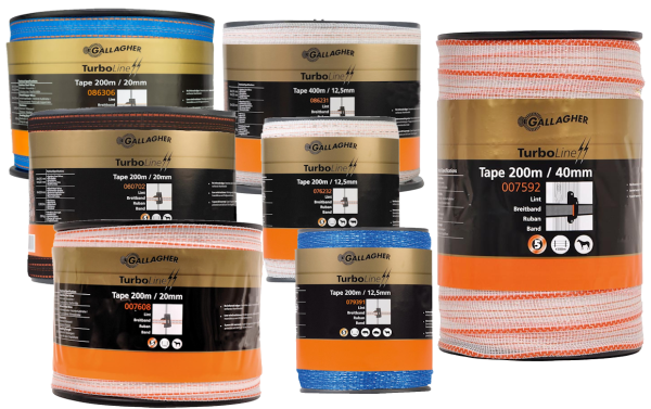 Das TurboLine Breitband von Gallagher ist ein hochleitfähiges, weiß / rotes oder blaues Kunststoffband mit Längs Drähten. Diese sind alle 13 cm über einen Nirostaleiter quer verbunden, dadurch erhält jeder einzelne Draht immer Spannung. Es ist 40 Mal leitfähiger als herkömmliches 5-drähtiges Band.