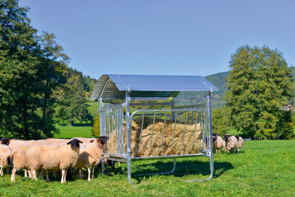 Die PATURA Viereckraufe für Schafe steht in zwei Ausführungen (mit und ohne Dach) zur Verfügung und ist bestens für Heu- und Silage-Rundballen bis Ø 1,40 m geeignet. Nachstellbare Fressgitter ermöglichen ein Anpassen der Raufe an unterschiedliche Ballengrößen und ermöglichen durch Nachschieben eine restlose Futteraufnahme. Der breite Trog sorgt für eine erhebliche Minimierung der Futterverluste. Zum leichten Beschicken per Frontlader lässt sich ein Seitenteil komplett öffnen. Der sichere Transport der Raufe erfolgt über die Dreipunktanhängung des Traktors.